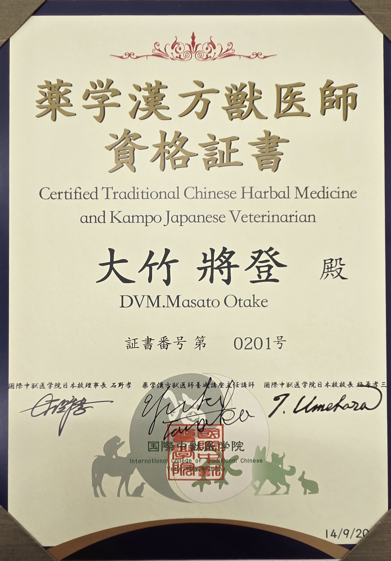 このたび、当院院長が「漢方薬学獣医師認定」を取得いたしました。